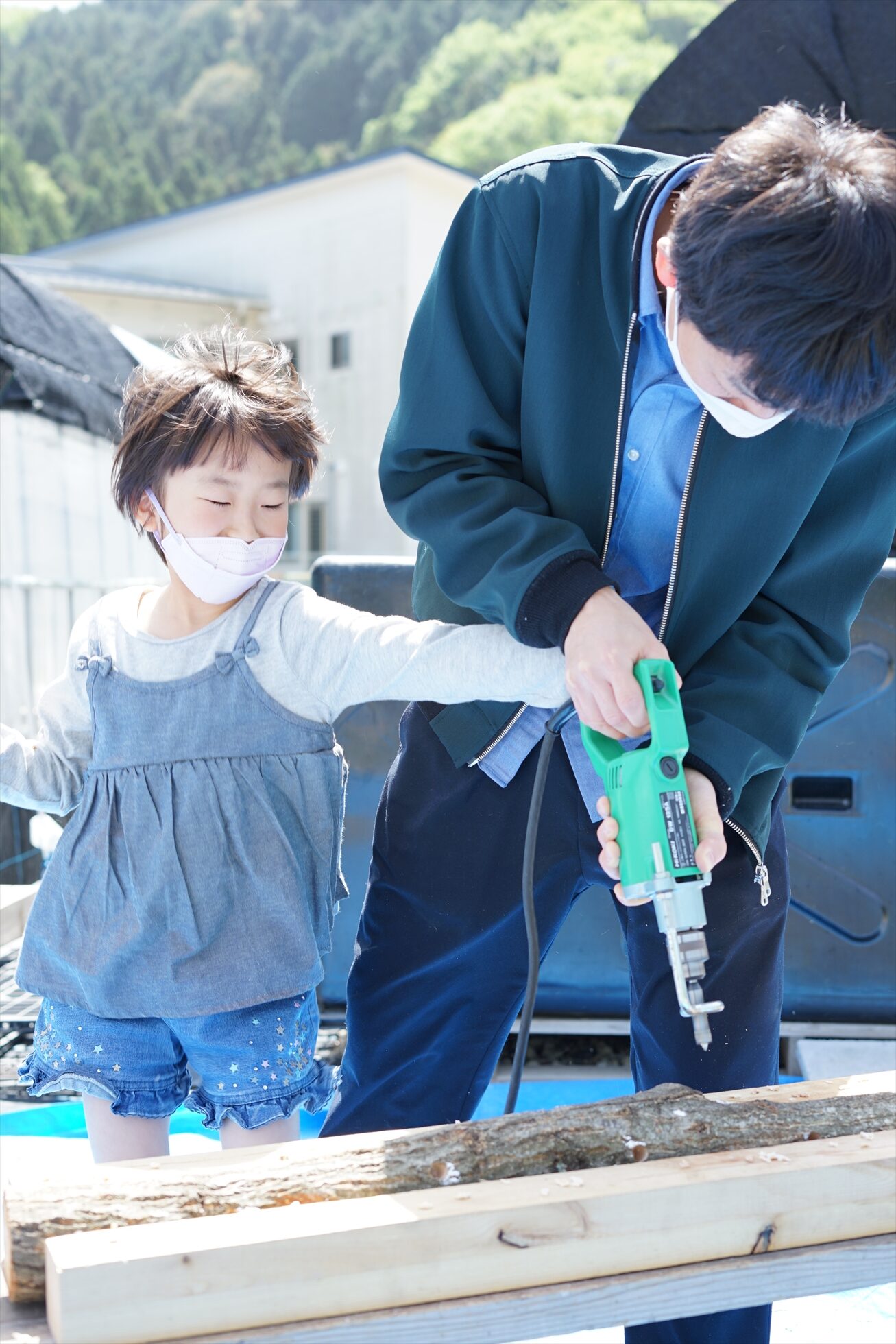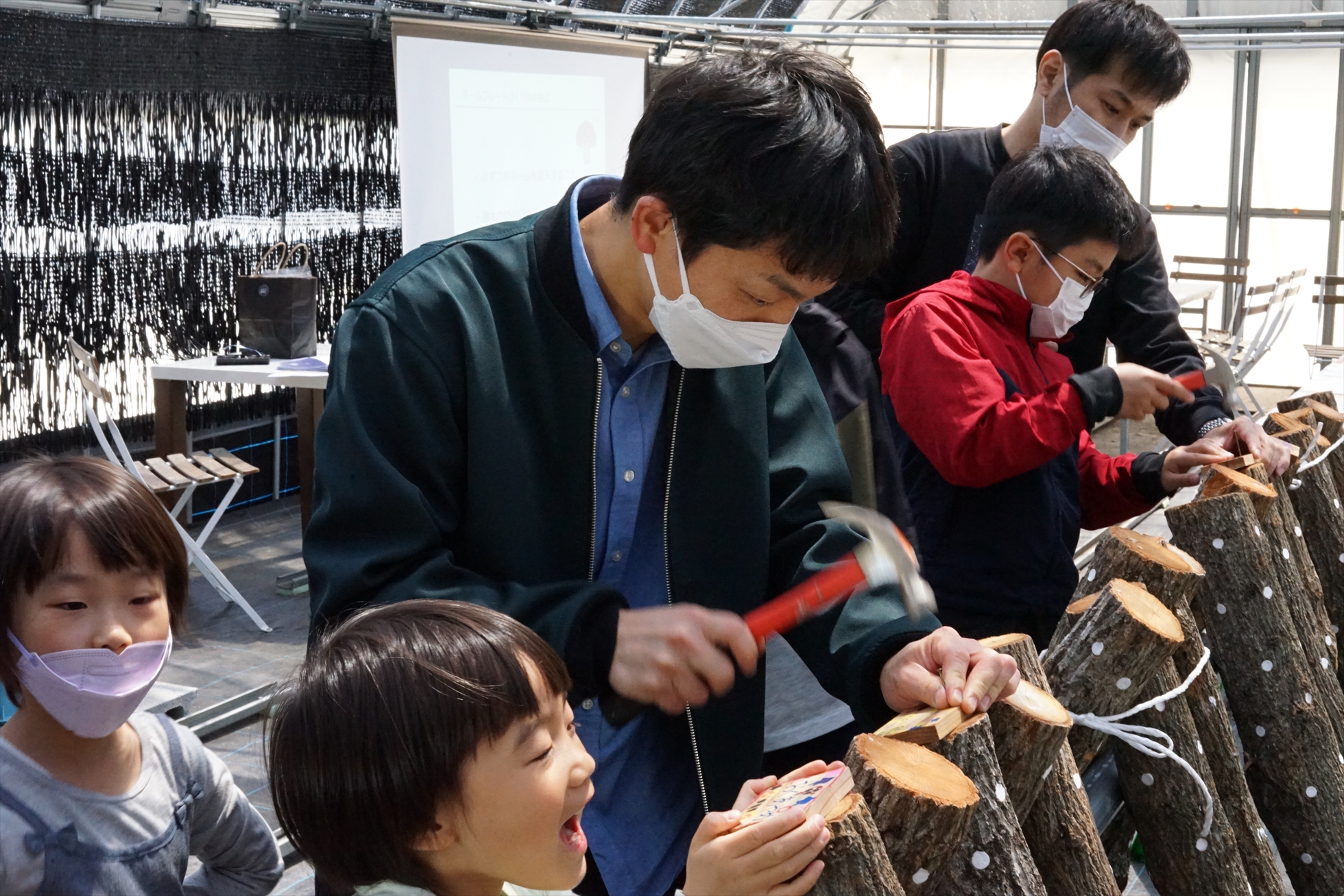 ドリルで原木に穴を開け、穴にしいたけの菌を植え、
