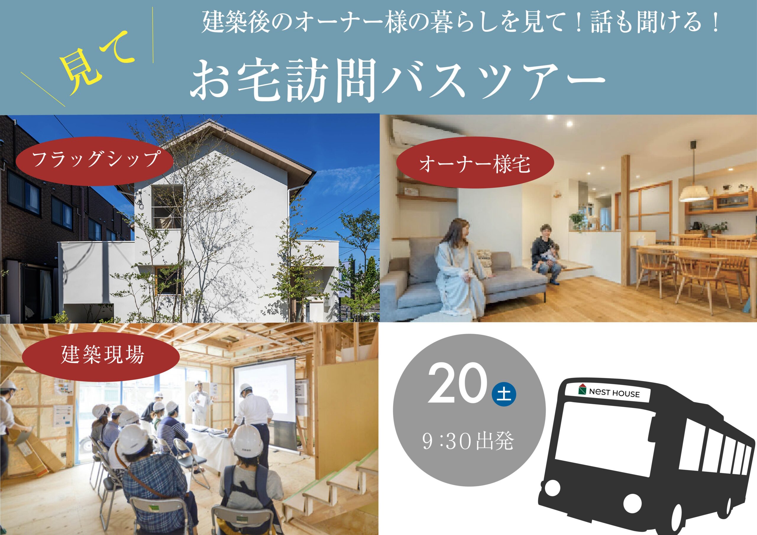 お宅訪問バスツアーは、実際にネストハウスで建てられた住まいを巡り、リアルな暮らしを体感できる特別なイベントです!