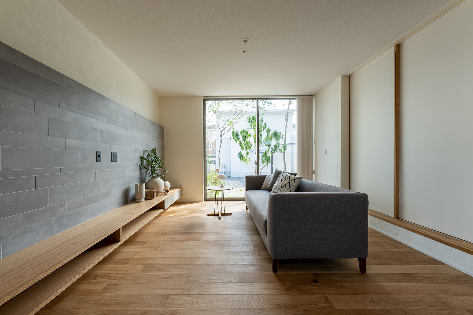ソファに腰掛けると、視線が自然と庭の緑へと抜けていきます。