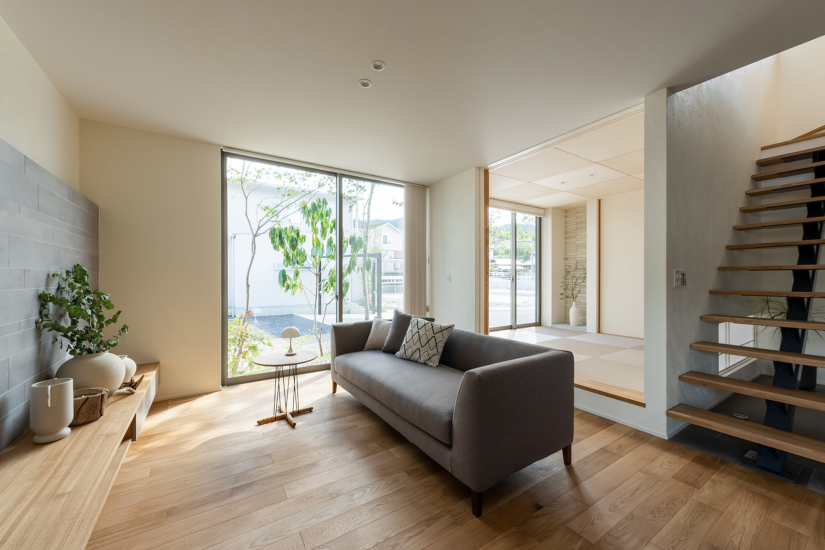 ソファに腰掛けると、視線が自然と庭の緑へと抜けていきます。