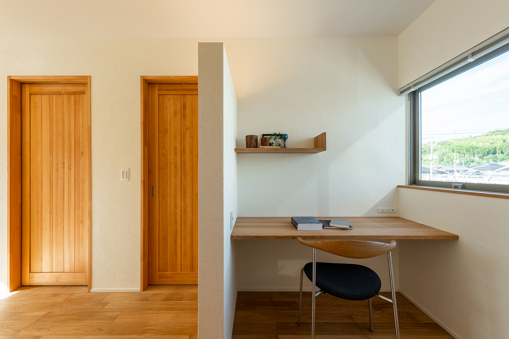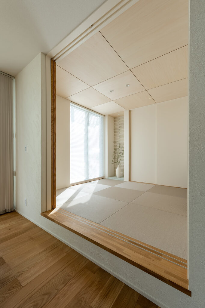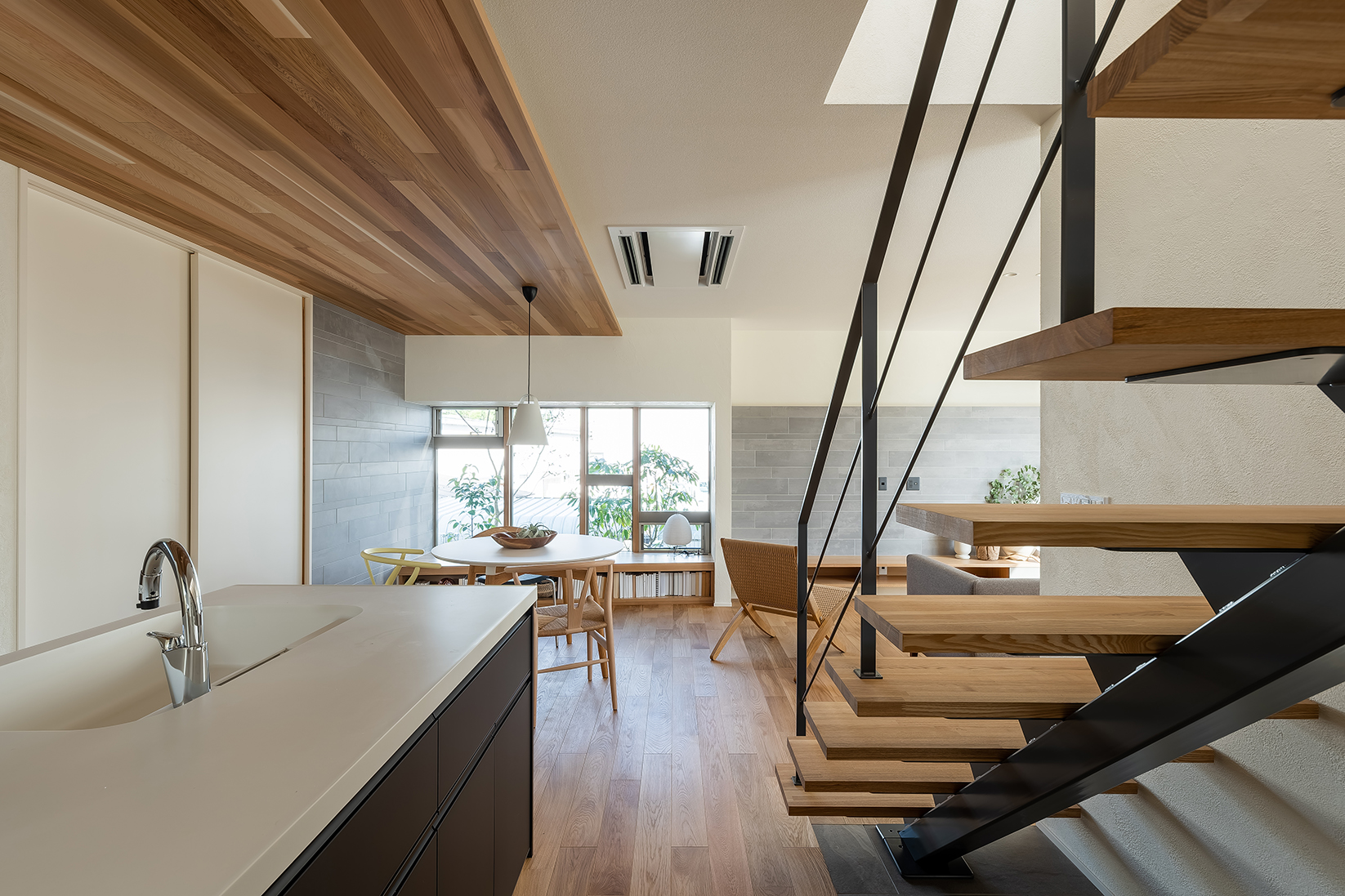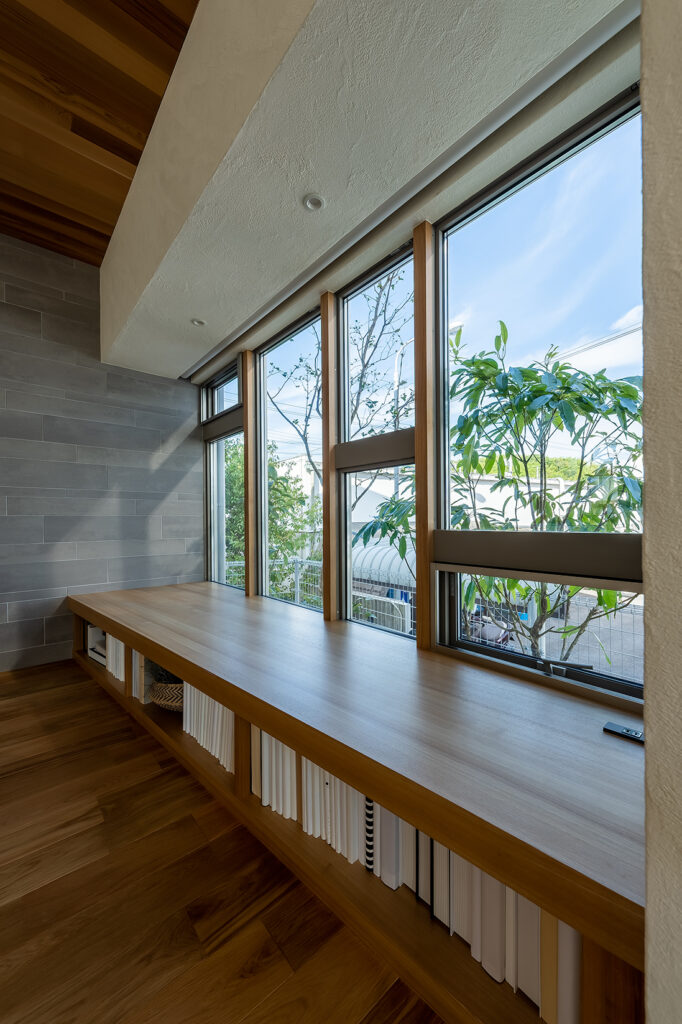 天井を高く感じる工夫と、外の景色を取り込む窓の配置。