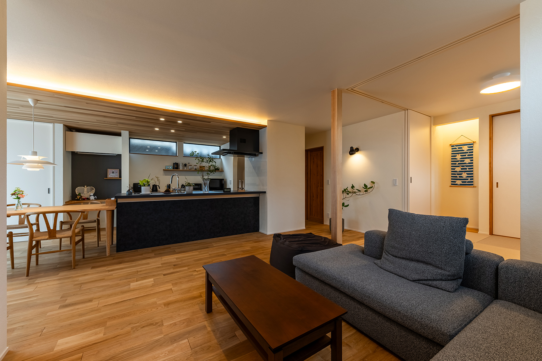 LDKを中心にゆるやかにつながる動線で、キッチン・リビング・ダイニングが一体となった心地よい広がりを生み出しています。