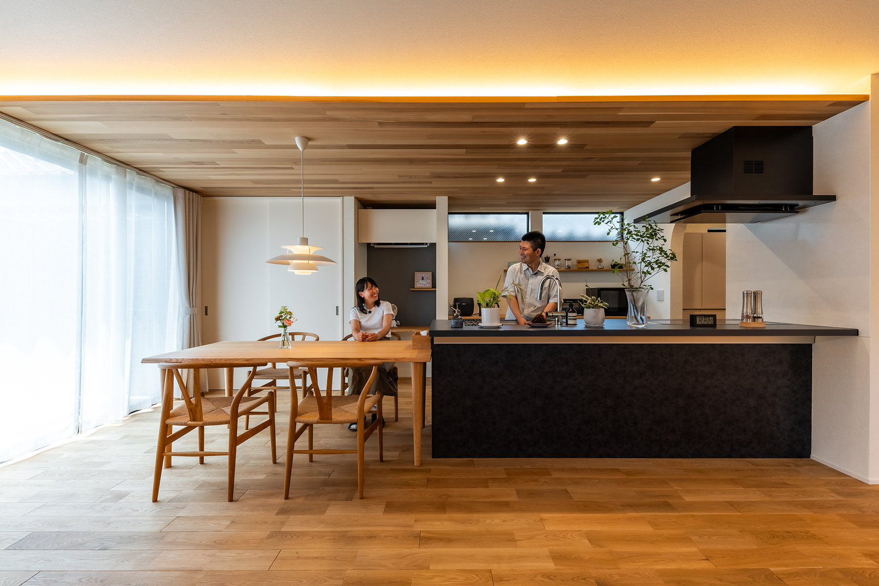 料理をしながらリビング全体を見渡せる設計で、ご夫婦が並んで調理する時間も快適です。